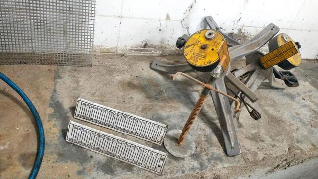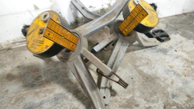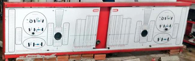 Um painel desmontável para alinhamento de carros, completo, contendo par de pratos, par de projetores, par de garras rápidas, par de bandeirolas, trava de volante e painel, funcionando, em bom estado de conservação.